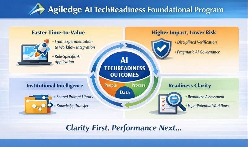 TechReadiness™ helps organizations lay the foundation for sustainable AI success by preparing the people side of adoption. Rather than treating AI as a collection of disconnected pilots, the program enables AI to become a repeatable, organization-wide capability embedded into day-to-day work. The approach aligns closely with Agiledge’s focus on practical readiness and measurable outcomes, while preserving a strong emphasis on institutional knowledge and workforce performance.